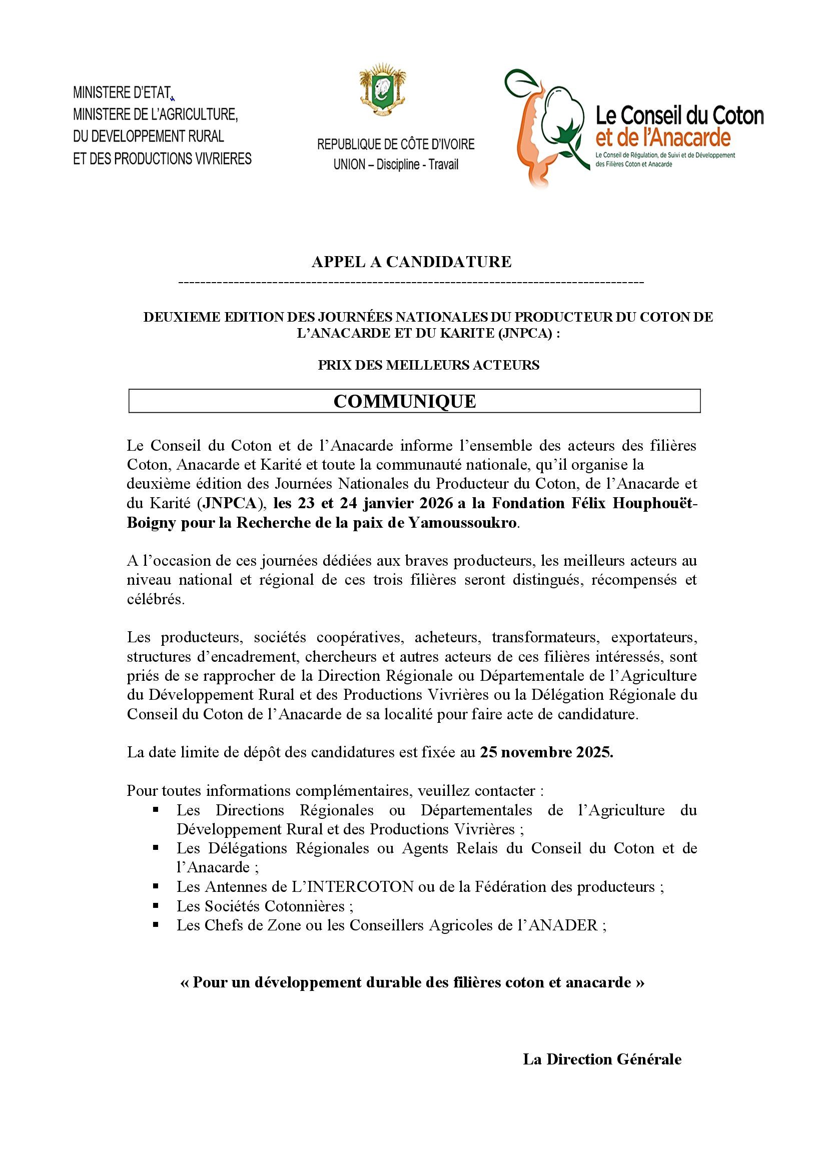 Les producteurs désireux de concourir sont invités à déposer leur candidature avant le 25 novembre 2025 auprès des représentations régionales du Conseil du Coton et de l’Anacarde ou des services du ministère de l’Agriculture.